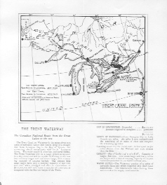 Pamphlet (Excerpt) The Canadian National Route from the Great Lakes to the sea The Trent Canal or Waterway is the name given to a series of navigable Lakes and Rivers lying in a straight line from Georgian Bay to the Bay of Quinte, and connecting almost immediately with the St. Lawrence River. The water supply is abundant and never failing. The Trent Waterway will be a barge system as opposed to a ship canal and will be capable of floating in one tow four ordinary barges and one steam barge, with a carrying capacity of 120,000 bushels. The present Erie canal barges have only a carrying capacity of 240 tons and even when enlarged and after an expenditure of [$101,000.000] will only have the capacity of 1,000 tons as compared with the 800 ton barges of the Trent. COST OF CONSTRUCTION – Expended ..$4,135,353 Amount required to complete .......................$5,000,000 Total Cost ..................................................$9, 135,153 LENGTH OF WATERWAY – From Georgian Bay to Lake Ontario 203 miles. 160 miles is now navigable and the canalizing of 17 miles of river will complete the remaining 43 miles. Counting return trip the Trent route to Liverpool is 500 miles shorter than the Welland and 1500 shorter than the Erie. CAPACITY – Size of Locks 134’ x 33’ x 8’:6". Capacity of barges 800 tons. One steam barge will tow 4 ordinary barges with a united carrying capacity of 120,000 bushels – equivalent to 120 loaded railway cars. WATER SUPPLY – The Waterway consists of a series of navigable lakes and rivers requiring only short canal connections. The innumerable lakes feeding these waters makes the supply [inexhaustable].