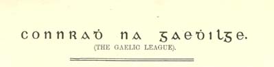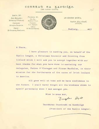 The Gaelic League's goal was to promote the use of Gaelic without being involved in politics. This allowed the league to focus on cultural aspirations and to go unnoticed by the British Government. The League did play an important political role, despite their policies. The Sinn Féin were quick to understand the League's influence over the general populous and used the same logic to explain the need for an Irish Republic. The league was founded by Douglas Hyde & Eoin MacNeill in 1893. Hyde was the first president of the league until 1915. It became a popular way for people who left Ireland to hold on to their past, as well as people still in Ireland. The Gaelic language had been on the verge of extinction since the 17th century. By the early 19th century it was only used in isolated rural areas and Gaelic became associated with 'backwardness' and poverty. The Gaelic League and the Irish Renaissance would subvert these ideas about the Gaelic Language and help it to achieve an honourable status. There is a letter from the Gaelic League which the above graphic is from. Shane Leslie discuses the Gaelic Question in Letter 4. There is also a letter entirely in Highland Gaelic. |