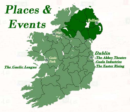 Sligo Bay - Sligo was an important feature of the Irish Renaissance. It was hit hard during the famine and those that remained felt particularly loyal to Ireland. Doulgas Hyde, president of the Gaelic league and eventually Ireland, was born there. The Yeats children spent whimsical summers there at their Pollexfen grandparents' home. It was this idealized childhood at Sligo Bay and the stories they heard there that W. B. Yeats and Jack Yeats drew on for many of their artistic endeavours. Their parents, John Butler Yeats & Susan Mary Pollexfen met here on a summer holiday. Innisfree, made famous by W.B. Yeats is in Sligo Bay, as is Rosses Point, (discussed in Letter 3, W.K. Magee to DeLury) and Lissadell House where Eva Gore-Booth's family lived. W. B. Yeats' body now lies under Ben Bulben also in Sligo Bay. |