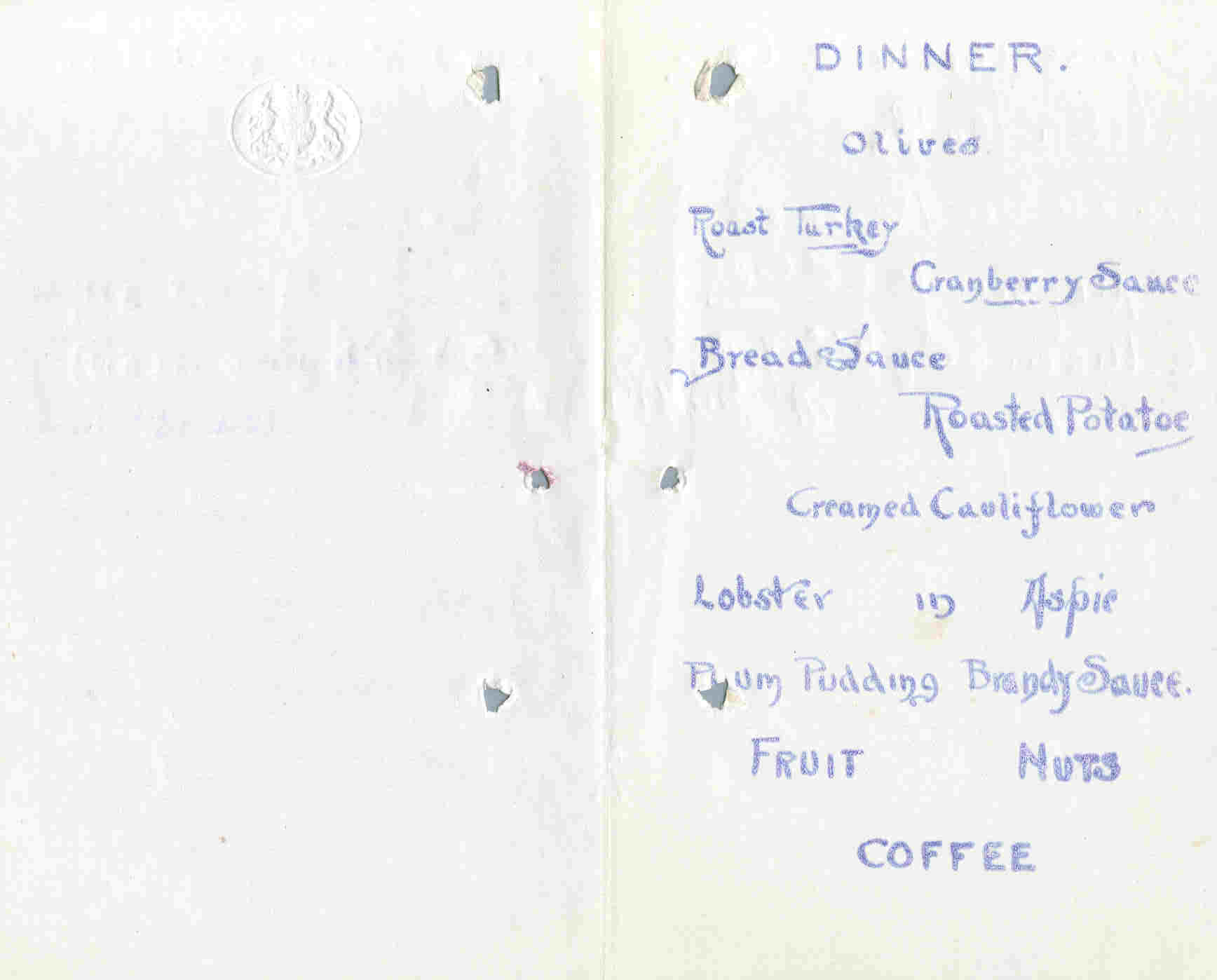 The menu consisted of "Cream of Tomato Soup - a huge dixie [ ] - and awfully good - croutons of toast left from breakfast - and retoasted. Two ounces of Port Wine each with which to toast the King but which was hastily swallowed in view of the coming excitement with nary a thought for their sovereign-